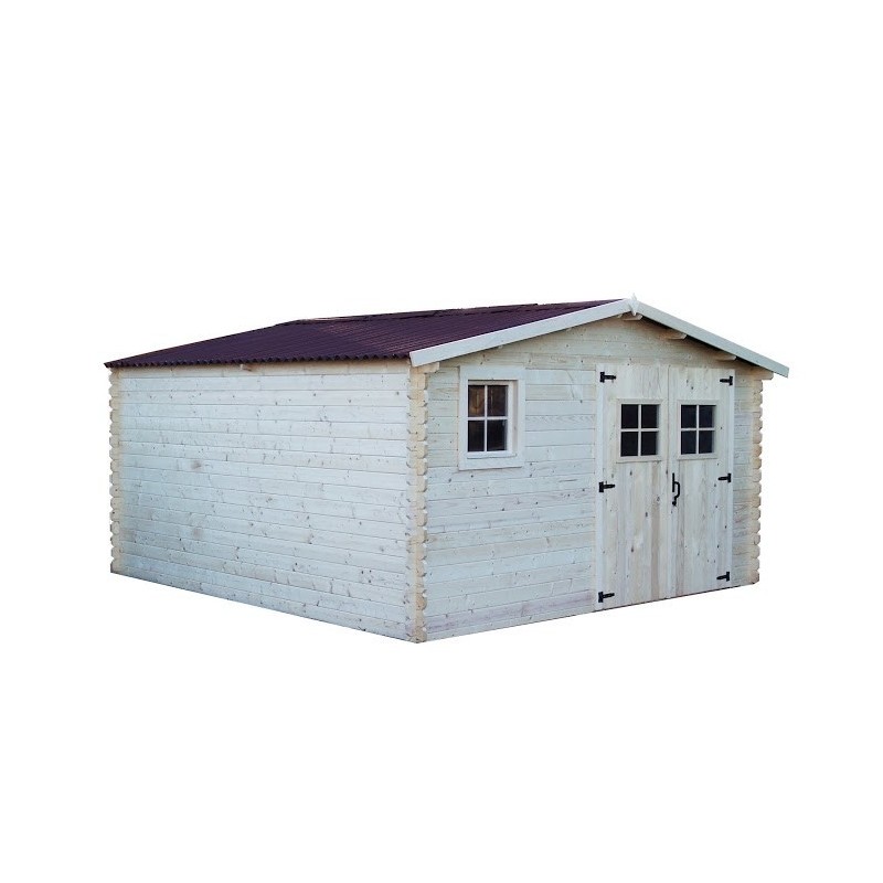 Abri Madriers massifs 28mm – 16,81m2 épicéa massif non traité, par la marque Habrita. Dimensions totales : 416 x 414 cm, Hauteur faîtage : 2,24m, montage à domicile en option.